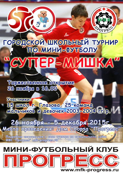В четверг, 26 ноября, в городе Глазове открылся городской школьный турнир по мини-футболу под названием «Супер-Мишка». Свое участие в данном турнире подтвердили 15 школ города Глазова – всего 25 команд-участниц: 14 команд мальчиков и 11 команд девочек 2003-2004 годов рождения, сообщает официальный сайт МФК «Прогресс». На открытие данного турнира собрались все участники, болельщики, руководством МФК «Прогресс» и города Глазова. После торжественных и напутственных слов всем участникам турнира были подарены памятные сувениры – блокнот и ручка с логотипами общероссийского проекта «Супер-Мишка» и глазовского МФК «Прогресс».